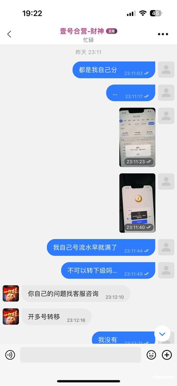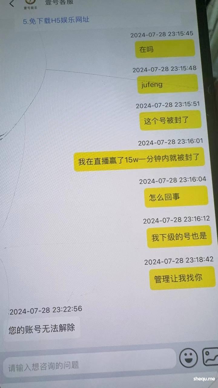 7.27我在 南宫 系列平台【壹号】充800一天赢了21w 4w分转给了下级玩  1w自己提了 分了几笔提 几个小时才到 故意延迟到账时间 然后我最后输到7w梭哈中了 15.7w 没有几分钟就把我账号黑了 我的下级们也都封了不给解封 前面说我开小号 转移分 我本来就是可以体现自己的分 打了五十多万流水 后面就是频繁转分 触发风控 不予处理 代理玩家请擦亮眼睛